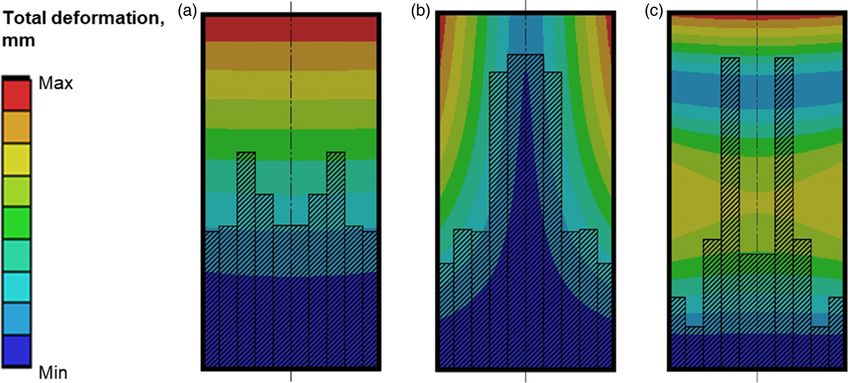 To conclude, the two-dimensional setup allows for better resolution of the stiffness/mass approach and therefore allows for higher frequency gains. The colours in Figure 6 represent total deformation on the plate surface and the dark blue region of the lowest deformation coincides with the filling pattern.