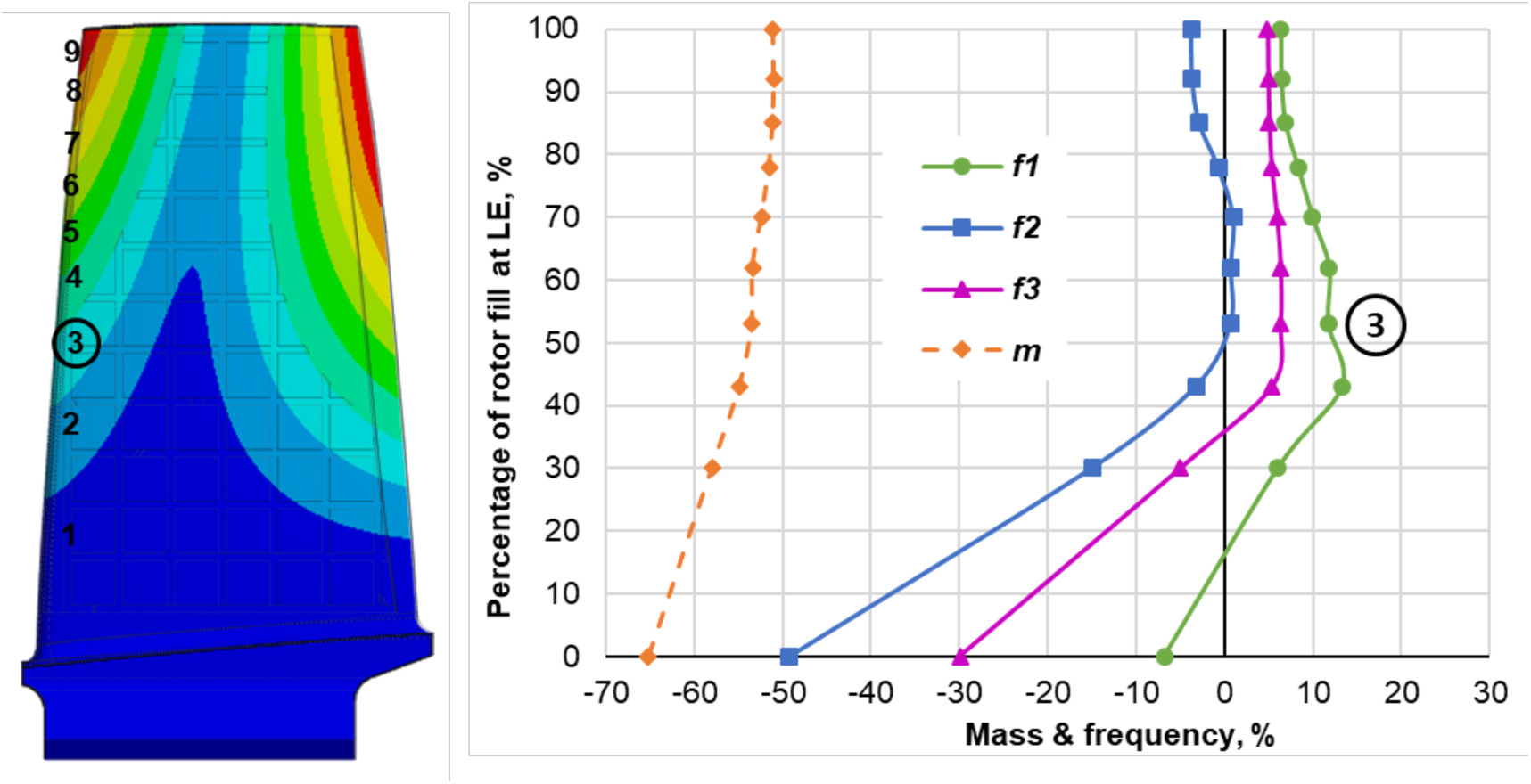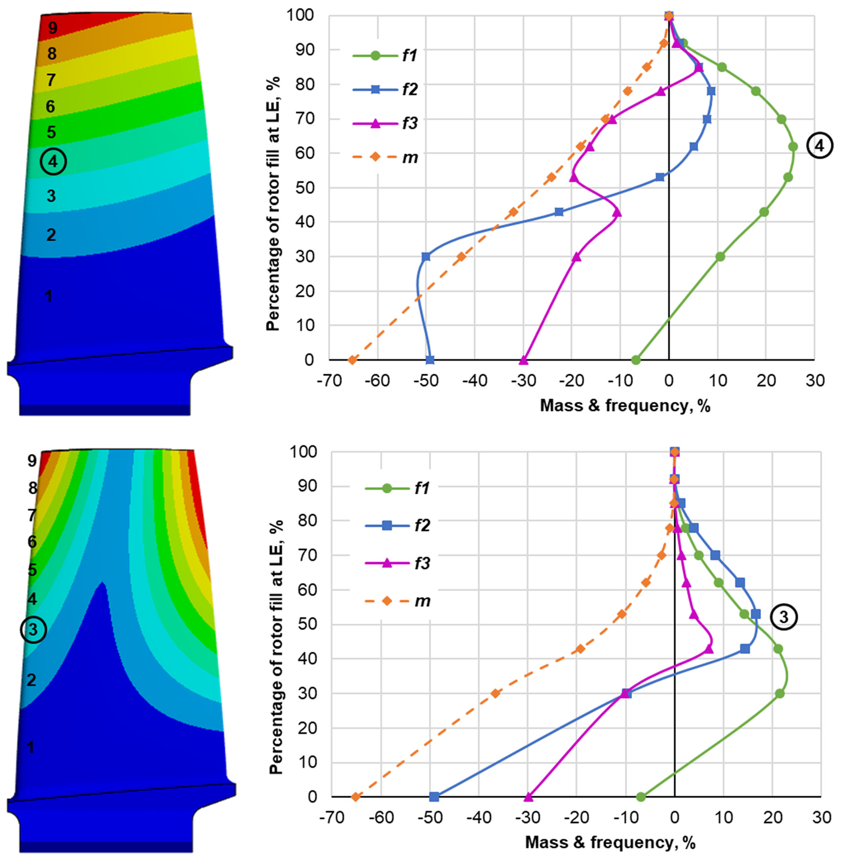 Left two plots in Figure 9 show the deformation contours of the blade with first bending (top) and first torsional (bottom) frequencies. Ten contours are drawn at each plot and each contour is numbered along the leading edge of the blade. On the right-hand side of this figure the graphs show changes in natural frequencies and mass for the blade where the solid infill is shaped according to one of the contours on the left. The vertical axis of the right-side plots is the percentage of infill height at the leading edge. For the contour with the highest gain in bending and torsional frequencies the numbers are circled.