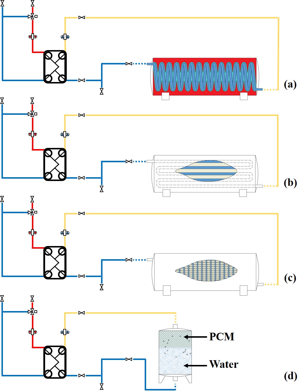 In this solution (Figure 3b), heat is transferred to the HTF through the heat exchanger from the storage material during the charging process and is then discharged when cooling is required by the system, respectively. Research interest to further enhancing the thermal performance of such systems has led to several alternatives such as the incorporation of fins either orthogonal or cylindrical (Chiu and Martin, 2012).