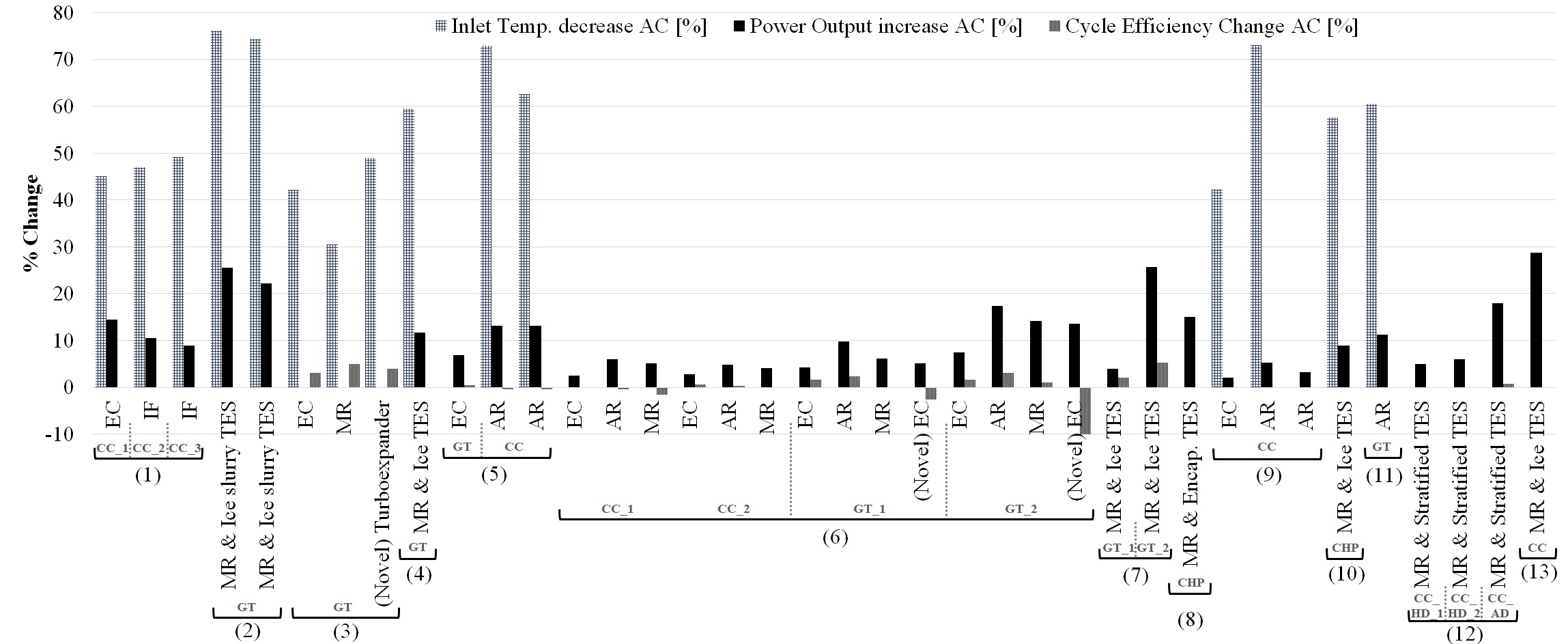 Al-Ansary et al., 2013; Al-Ibrahim and Varnham, 2010; Alhazmy and Najjar, 2004; Ameri et al., 2007; Ameri and Hejazi, 2004; Baakeem et al., 2018; Bhargava and Meher-Homji, 2005; Boonnasa et al., 2006; Bracco et al., 2007; Chacartegui et al., 2008; Farzaneh-Gord and Deymi-Dashtebayaz, 2011; Kakaras et al., 2006; Kwon et al., 2016; Kim and Ro, 2000; Meher-Homji and Mee, 2000; Palestra et al., 2008; Sigler et al., 2001.